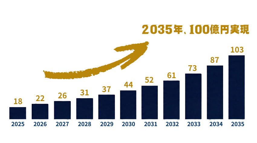 2035年の売上高100億円達成を目標に掲げ、年率19%程度の成長を目指しています。現在の売上高は18億円(2025年5月期)であり、東京支店の新設を含め、事業領域を急速に拡大中です。